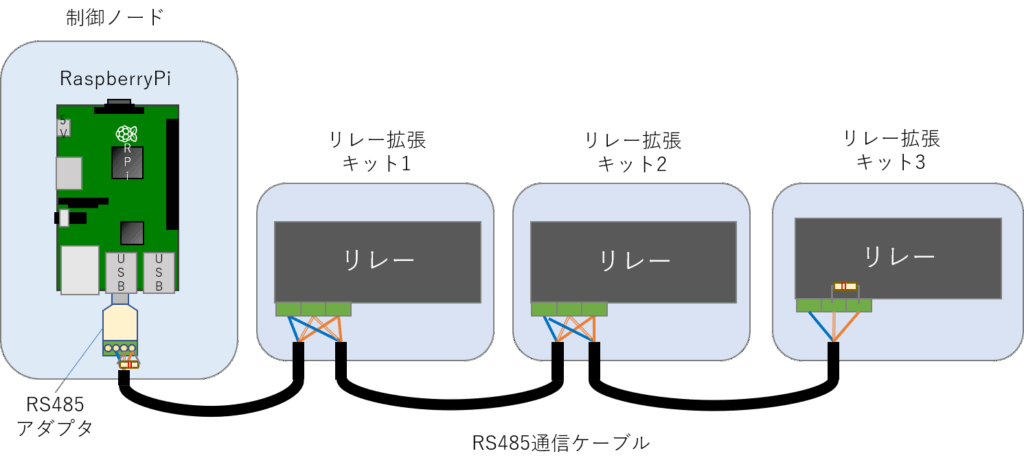 リレー拡張キットはRS485方式で通信するため、マルチドロップ接続が可能です。