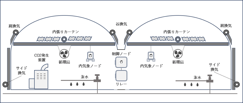 例えば、開閉制御7系統(肩換気2つ、谷換気1つ、内張りカーテン2つ、サイド換気2つ)、ON/OFF制御5系統(潅水2つ、循環扇2つ、CO2発生装置1つ)を制御するには、19チャンネルが必要です。