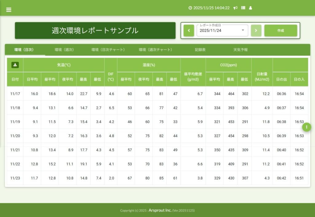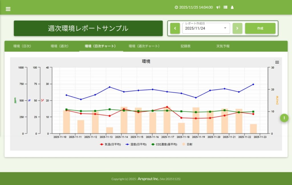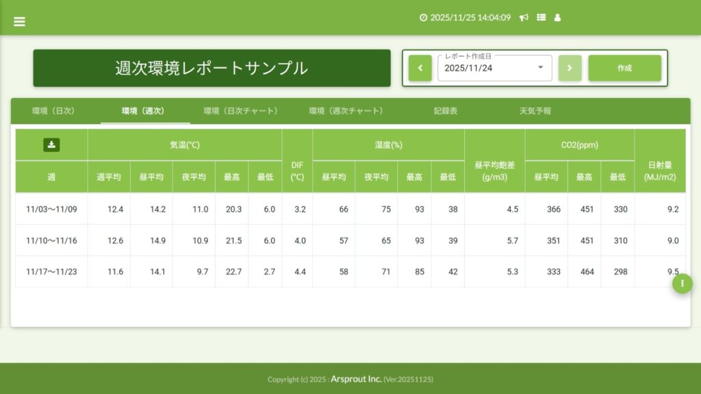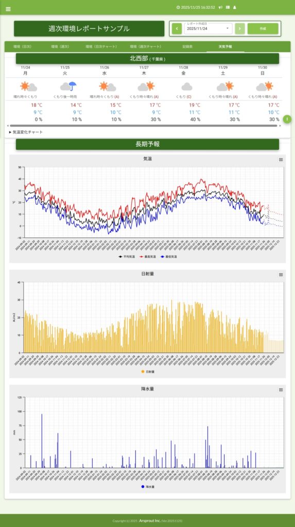 レポート機能は、センサの計測値、作物の生育状況、天候(気温・日射量・降雨量)をグラフ等に集約して、栽培実績の振り返りと次回の栽培計画を立てることができます。環境データと突き合わせることで「なぜこうなったか」という要因の深堀をサポートします。レポート機能の詳細はこちらをご参照ください。